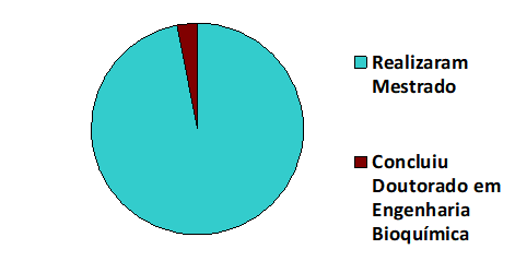 32 (trinta e dois) realizaram Mestrado, ou seja, 97% e 1(um) concluiu o Doutorado em Engenharia Bioquímica, ou seja, 3% do total