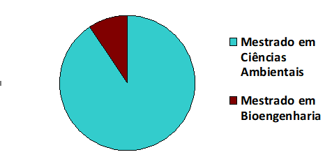 29 (vinte e nove) concluíram o Mestrado em Ciências Ambientais, ou seja, 91% e 3(três) concluíram o Mestrado em Bioengenharia, ou seja, 9%